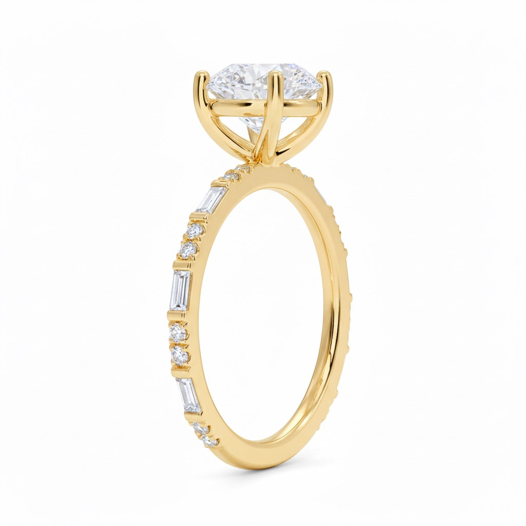 Round-Cut Engagement Ring with Baguette and Round Pavé Band