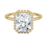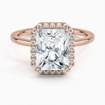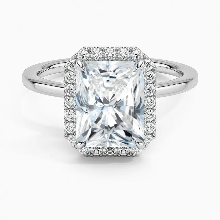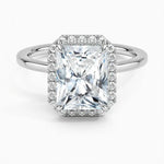 Discover the elegance of our Halo Radiant Engagement Ring featuring a stunning ApolloGem Moissanite center stone. This exquisite ring is designed to captivate with its radiant-cut moissanite, encircled by a halo of smaller moissanite stones, creating a dazzling display of brilliance.