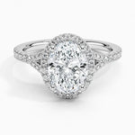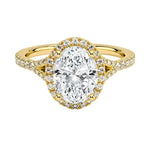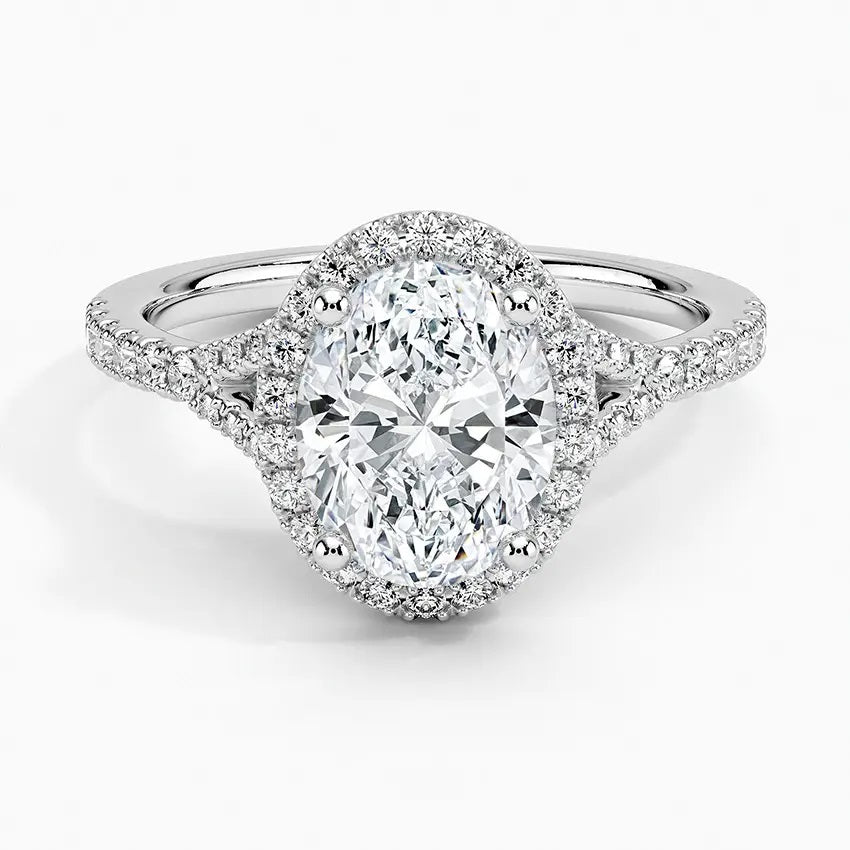 Elevate your engagement with our Oval-Cut Halo Engagement Ring featuring a pave band. This exquisite ring combines the elegance of an oval-cut moissanite with the brilliance of a halo setting. Perfect for those seeking a timeless and dazzling piece, this ring is an ideal choice for a memorable engagement.