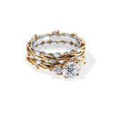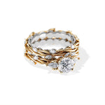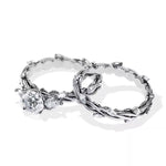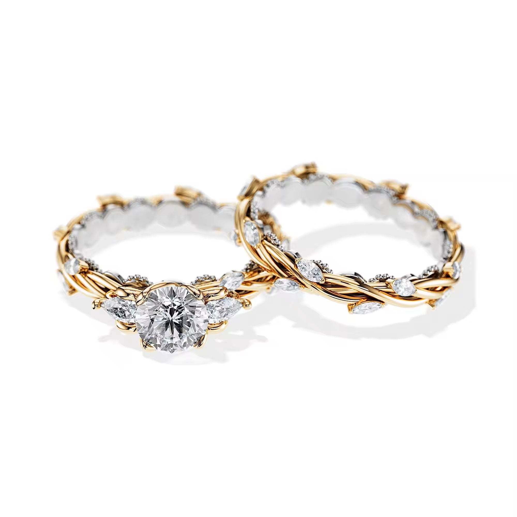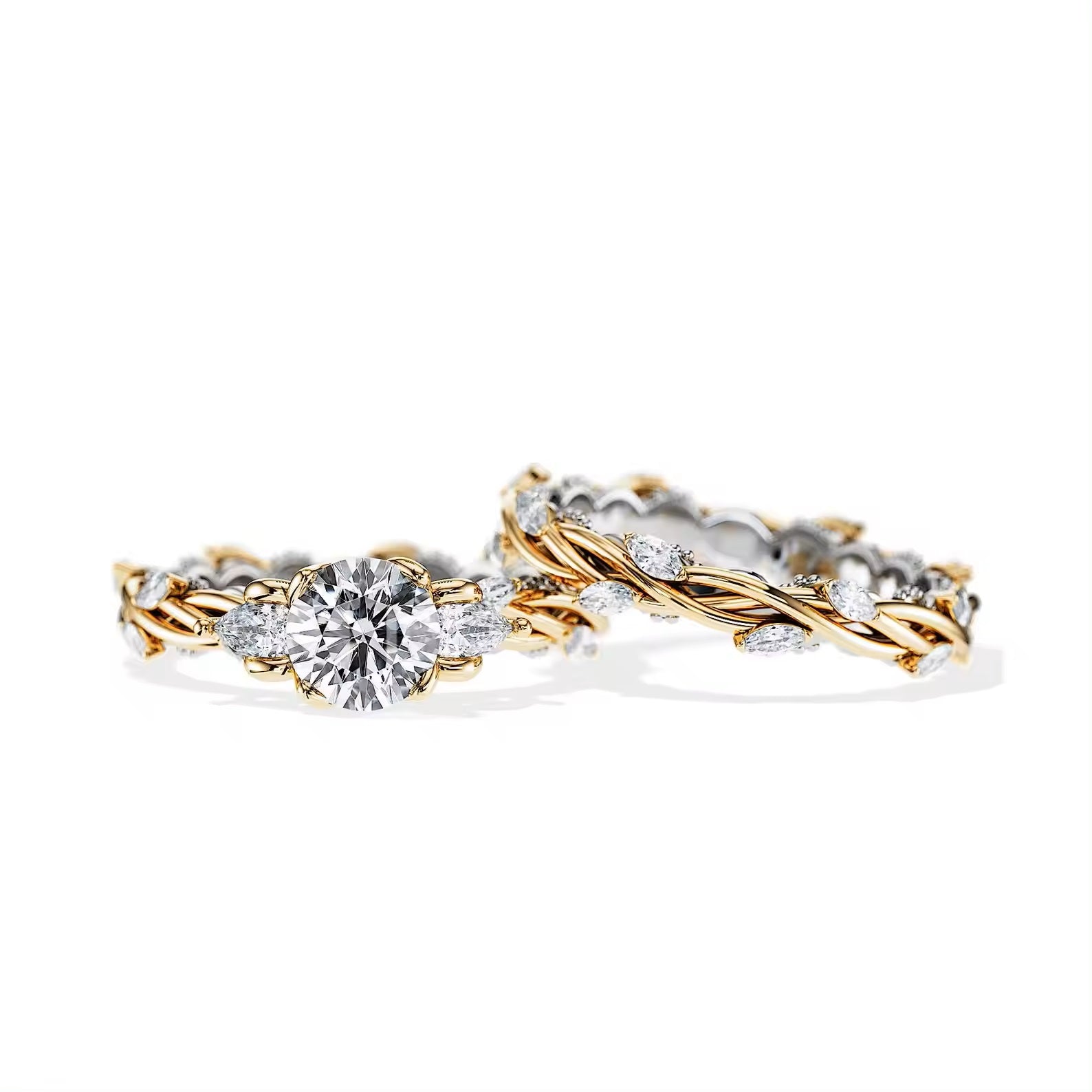 Celebrate your love with our exquisite Elegant and Unique Two-Tone Bridal Set. Expertly crafted by ApolloGem, this stunning bridal set features a brilliant round moissanite set in a classic halo setting, paired with a unique ornate band. This set epitomizes timeless elegance and sophistication.
