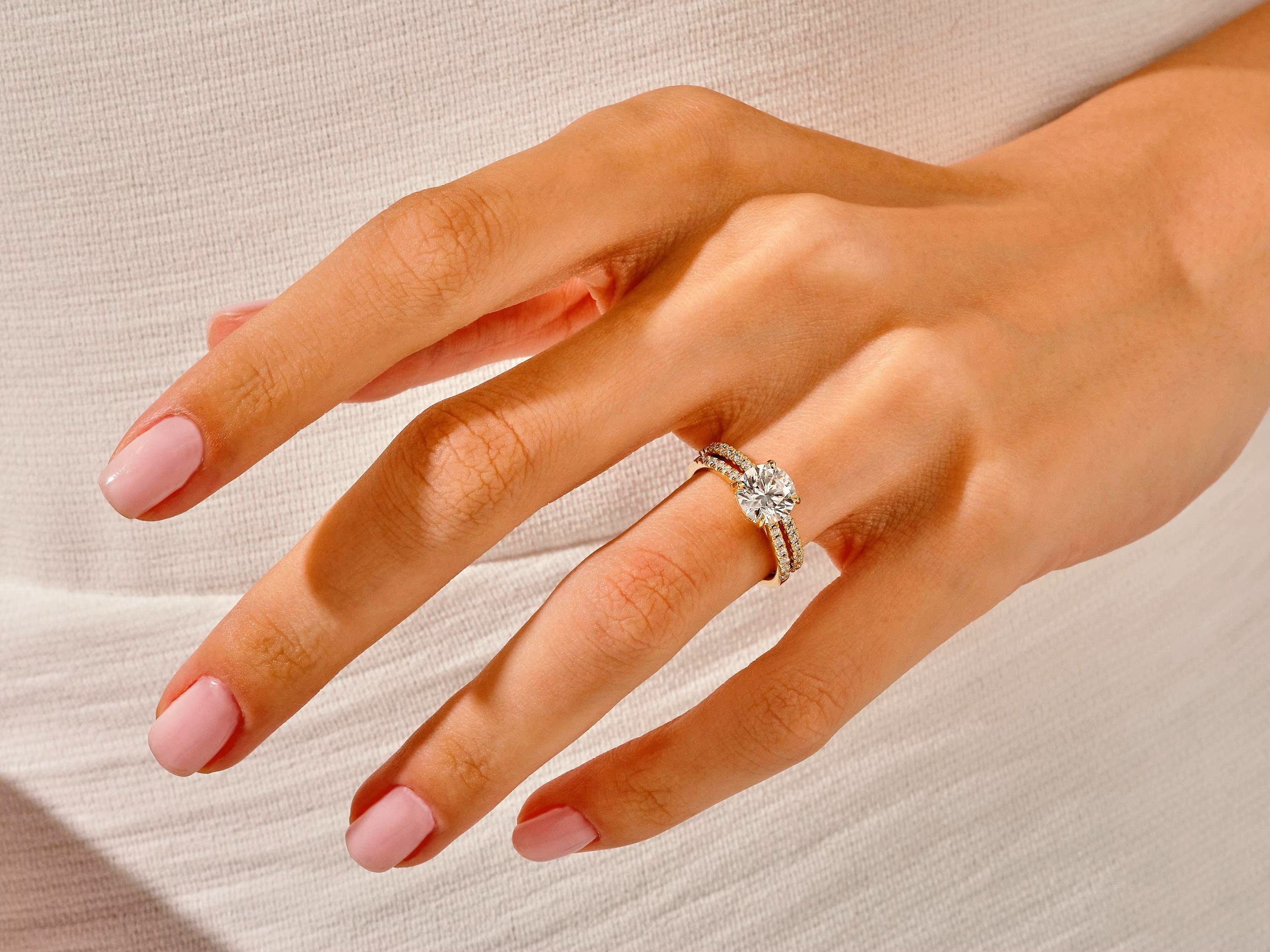 Round Moissanite Engagement Ring: The centerpiece of this engagement ring is a round moissanite, renowned for its exceptional brilliance and classic appeal. The round cut enhances the stone's natural sparkle, creating a breathtaking focal point.
