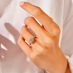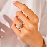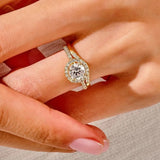 Halo Setting: The moissanite is surrounded by a halo of diamonds, adding extra sparkle and creating a vintage-inspired look. This halo setting enhances the brilliance of the central stone and gives the ring a luxurious feel.