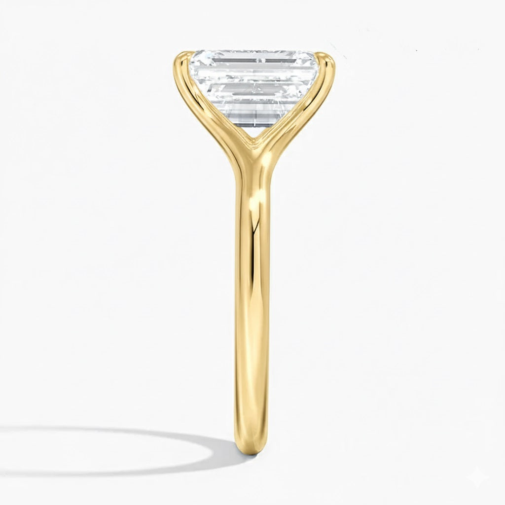 Gold Band: Available in yellow gold, white gold, or rose gold, the band is meticulously crafted to perfection, providing a timeless yet contemporary look that complements the emerald-cut center stone beautifully.