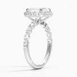 Gold Band: Available in yellow gold, white gold, or rose gold, the band is meticulously crafted to complement the central stone and halo. The small round diamonds continue partially down the band, adding extra sparkle and sophistication.