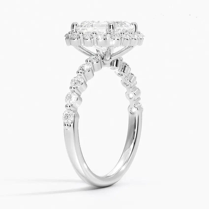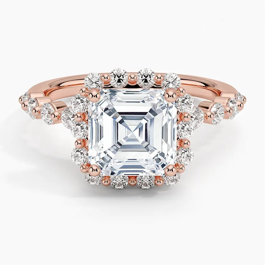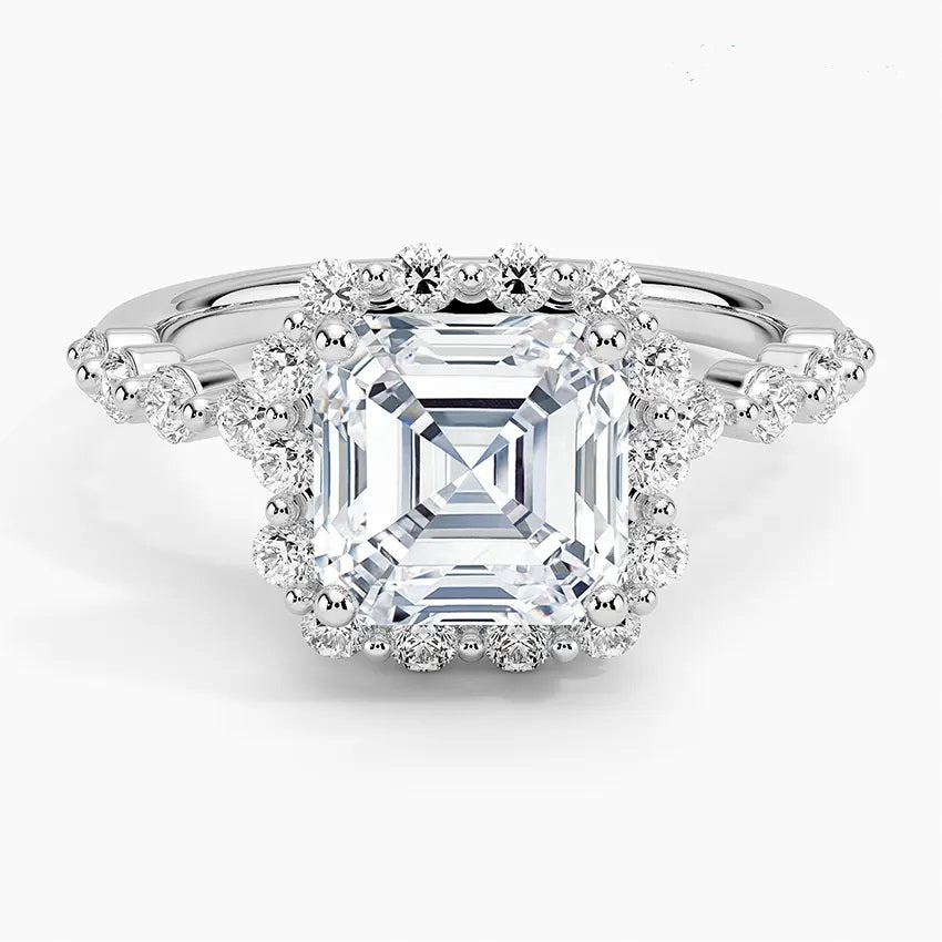 Halo Design: The central Asscher cut moissanite is surrounded by a halo of smaller round diamonds, amplifying its brilliance and creating a dazzling effect. The halo not only enhances the central stone's sparkle but also adds a touch of vintage charm to the ring.