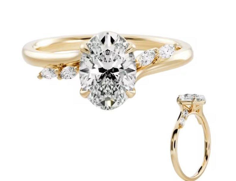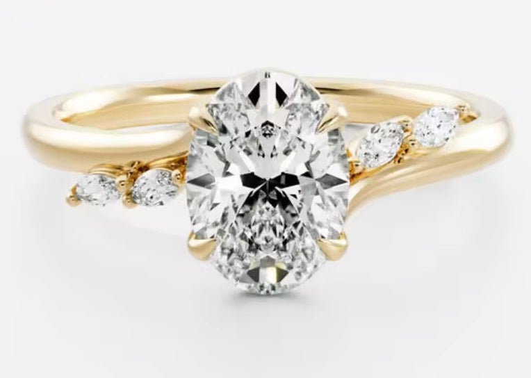Two Marquise Side Stones: Flanking the central moissanite are two marquise-cut side stones, which add an extra layer of elegance and sparkle, creating a harmonious and sophisticated look.