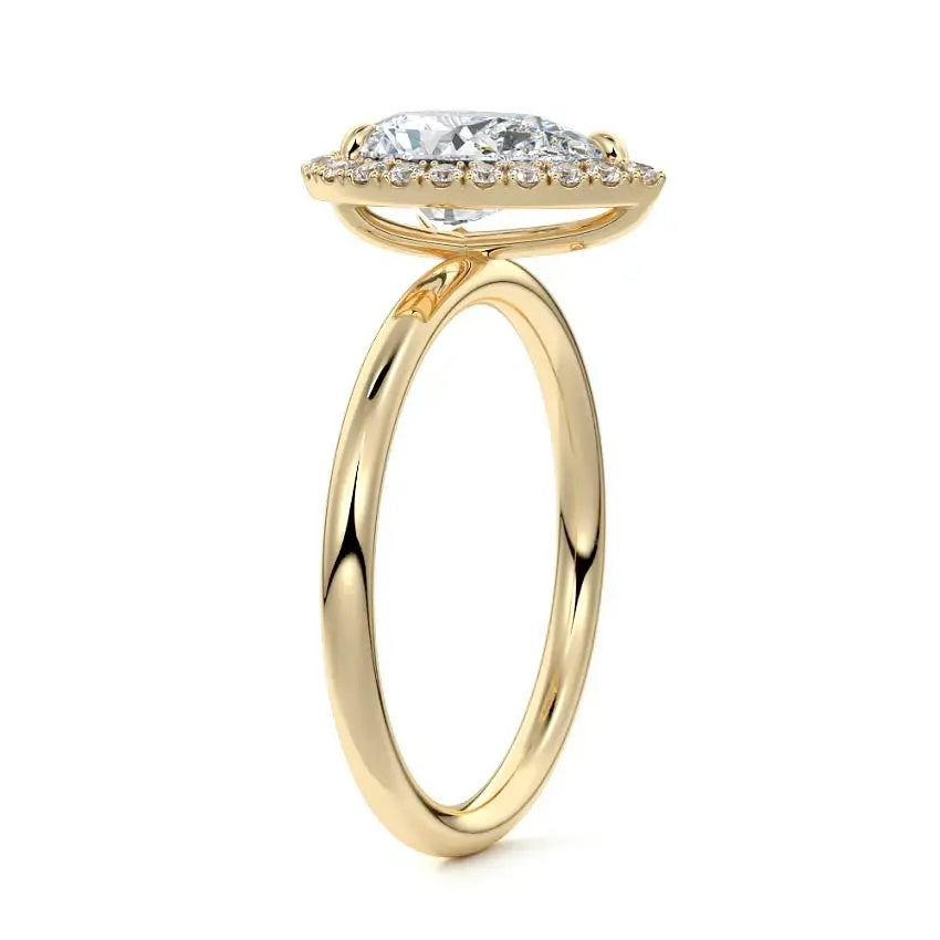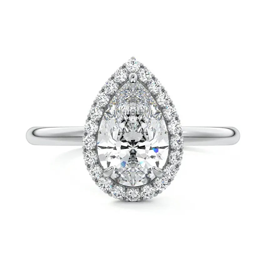 Timeless Elegance: The combination of a pear-cut moissanite and a halo setting creates a timeless and sophisticated look.