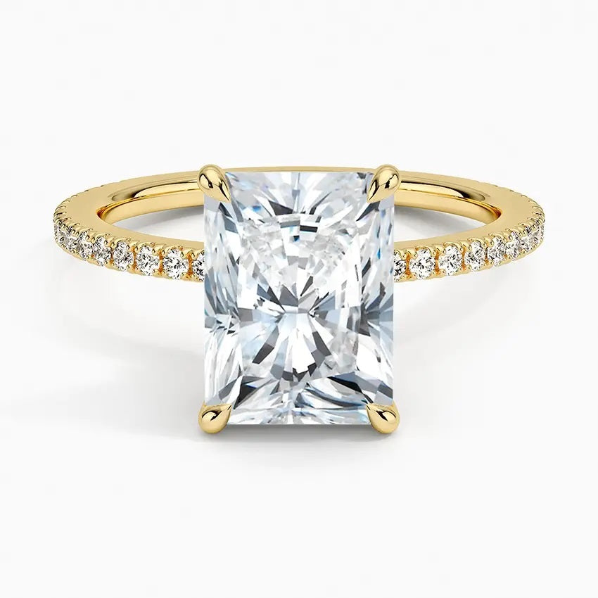 Gold Band: Available in yellow gold, white gold, or rose gold, the band is meticulously crafted to perfection, providing a timeless yet contemporary look that complements the radiant cut center stone beautifully.
