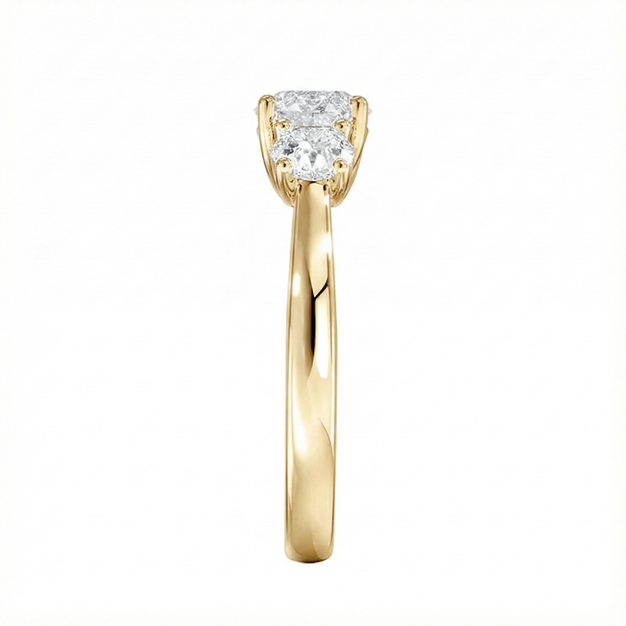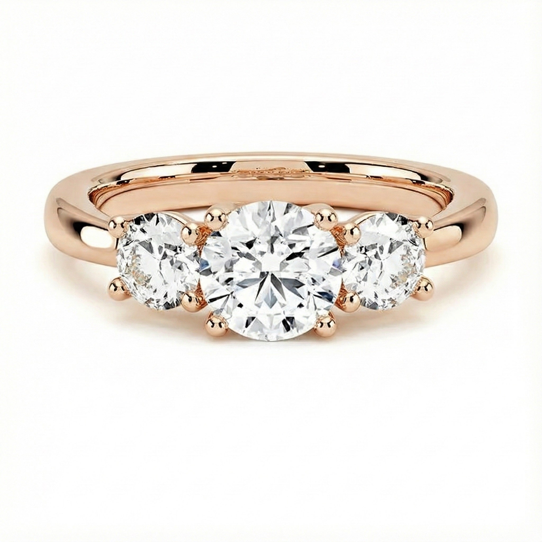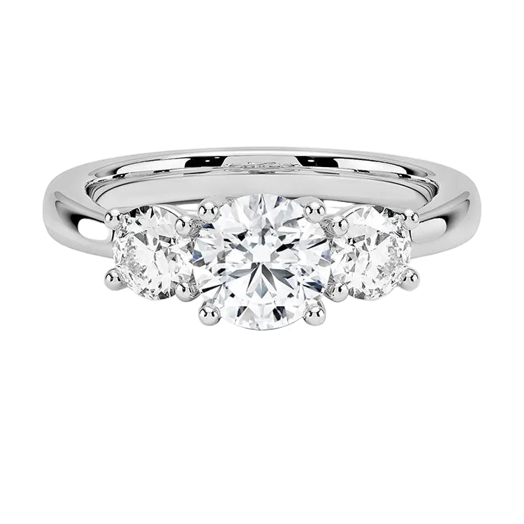 Unrivaled Brilliance: The Round Brilliant cut is engineered to reflect the most light. With 57 facets on each stone, this trilogy ring offers a continuous explosion of sparkle.