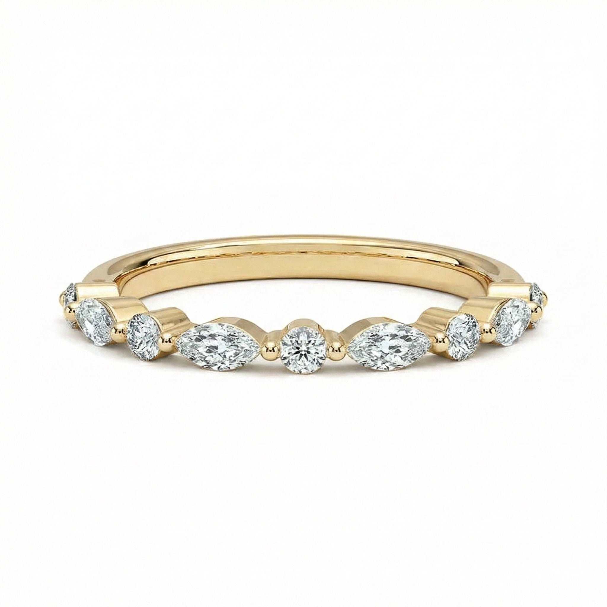 Description: Celebrate your love with the natural beauty of The Botanical Eternity. This captivating wedding band features a rhythmic dance of two distinct diamond shapes: the elongated, leaf-like Marquise Cut and the classic Round Brilliant Cut.