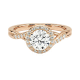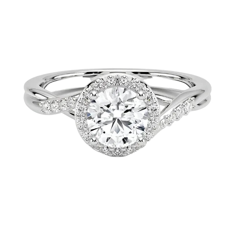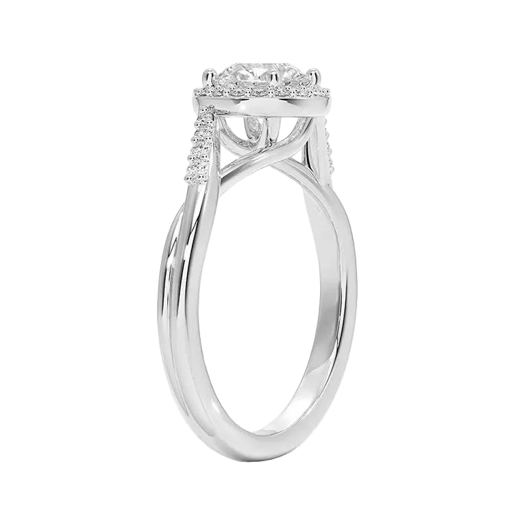 Description: Symbolize your eternal love with The Infinity Halo. This incredibly romantic design features a brilliant Round Cut Moissanite surrounded by a sparkling halo, set upon a whimsical intertwining band.